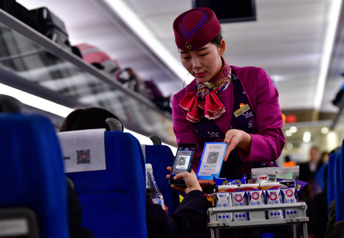 圖為在重慶客運(yùn)段G8516次列車上,一名旅客在使用手機(jī)掃碼支付購(gòu)買飲用水。新華社記者 劉潺 攝