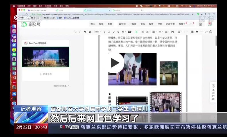 這份調(diào)查報告只是這幾個女生寒假作業(yè)中很小的一部分,事實(shí)上,學(xué)校給孩子們布置的探究類和實(shí)踐類作業(yè)可謂是五花八門。打開首師大附中初二4班的微信公眾號和視頻號,一陣歡暢的青春氣息迎面撲來。助力冬奧、運(yùn)動、烹飪、閱讀、手工藝制作,眼花繚亂的圖片和視頻記錄了孩子們多姿多彩的寒假生活,而這些公眾號文章,都是同學(xué)們自己制作的。要把這么多的素材全部整合到一篇文章里,還真是要花費(fèi)一番不小的功夫。修圖、排版、審稿,每一樣工序都不能少。