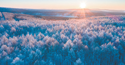 他覺得最奇妙的還是霧凇。在林子里行走,就像走進(jìn)了一個(gè)奇幻世界,周圍的一切都似乎不真實(shí)了。樹木幾乎全都看不出原先的面貌、品種,盡是一片雪白。湊到近處仔細(xì)看,樹枝上掛著的白色是一片片雪花聚集在一起,厚厚的白雪壓著整棵大樹。
