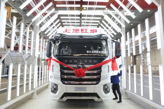 上汽紅巖鄂爾多斯基地天隆工廠生產(chǎn)的首臺(tái)氫能重卡。(受訪者供圖)