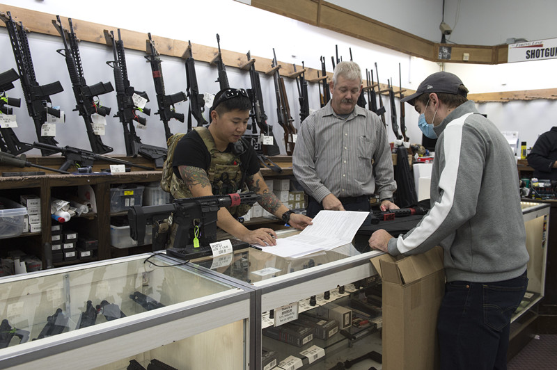 資料圖:美國(guó)槍店工作人員為顧客選購(gòu)彈藥