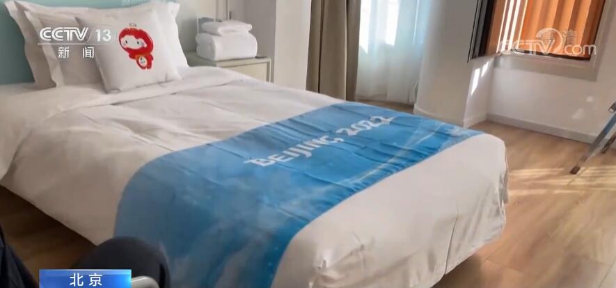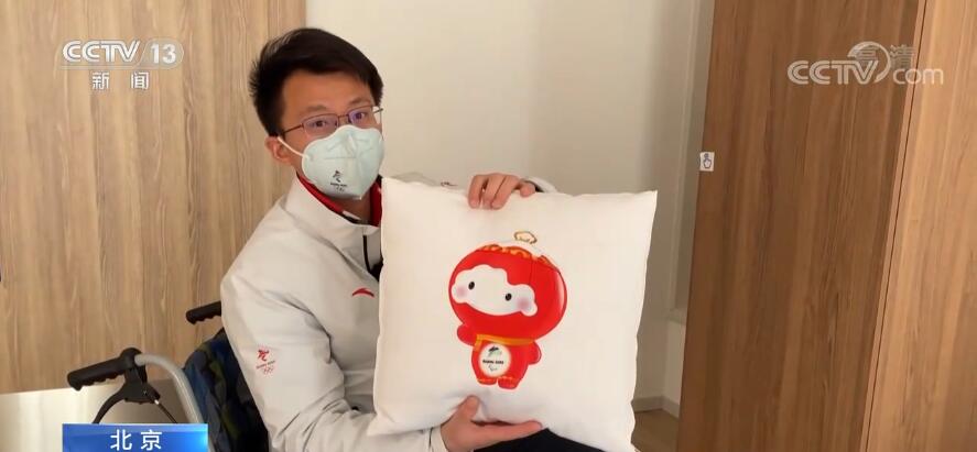 這是冬殘奧運動員公寓的樣板間,有很多無障礙的設施。比如說,所有的門都是單臂可以操作的推拉門,還有扶手、浴凳等等。我們再來臥室里面看看,這是給坐輪椅運動員使用的床,床腳相對于冬奧會的時候降低了10公分,便于上下床。我們看到床頭有一個抱枕。這面是北京冬殘奧會的會徽“飛躍”,這一面是北京冬殘奧會的吉祥物“雪容融”。(抱枕)打開之后就能成為一個毯子,有冬殘奧會各項目的運動圖標,這個抱枕到時候是送給運動員。