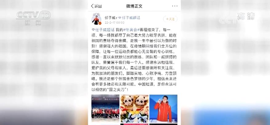2月17日,任子威在社交媒體(微博)上寫(xiě)道:“我的冬奧會(huì)賽程結(jié)束了,每一項(xiàng)、每一場(chǎng)我都盡了自己最大努力咬牙去拼,能在祖國(guó)的賽場(chǎng)奪得金牌,是我一生中最引以為傲的時(shí)刻!中國(guó)短道,是你永遠(yuǎn)可以相信的“國(guó)之尖刀””!