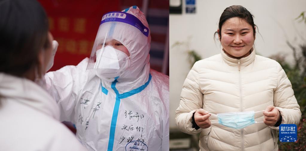 拼版照片:左圖為在蘇州工業(yè)園區(qū)西湖社區(qū)青湖麗苑小區(qū)核酸采樣點(diǎn),護(hù)士朱明星(前)穿上隔離服,準(zhǔn)備上門(mén)進(jìn)行核酸采樣(2月22日新華社記者季春鵬攝);右圖為朱明星在酒店房間為蘇州人民和抗疫人員“比心加油”(2月22日攝,受訪者提供)。朱明星2008年經(jīng)歷過(guò)汶川大地震,她說(shuō),“我想盡自己的綿薄之力,報(bào)答社會(huì)。我一個(gè)人是微不足道的,但是大家齊心協(xié)力,點(diǎn)點(diǎn)星火定將匯聚成必勝光芒!敝烀餍钦f(shuō)。蘇州本輪疫情發(fā)生以來(lái),廣大醫(yī)護(hù)人員、社區(qū)工作人員、志愿者堅(jiān)守崗位,不舍晝夜,奮戰(zhàn)在抗疫一線,與病毒較量,與時(shí)間賽跑,匯聚成抗擊疫情的磅礴力量。新華社發(fā)