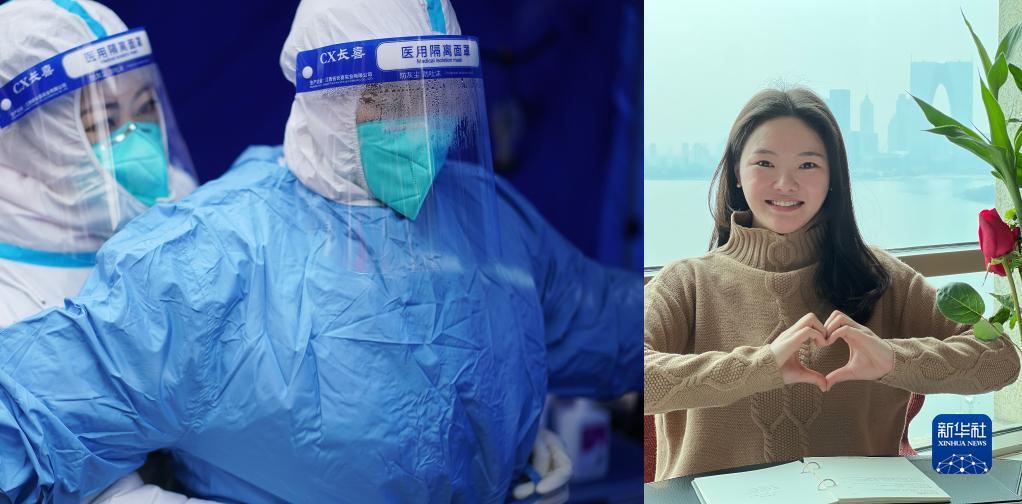 拼版照片:左圖為在蘇州工業(yè)園區(qū)西湖社區(qū)青湖麗苑小區(qū)核酸采樣點(diǎn),護(hù)士朱明星(前)穿上隔離服,準(zhǔn)備上門(mén)進(jìn)行核酸采樣(2月22日新華社記者季春鵬攝);右圖為朱明星在酒店房間為蘇州人民和抗疫人員“比心加油”(2月22日攝,受訪者提供)。朱明星2008年經(jīng)歷過(guò)汶川大地震,她說(shuō),“我想盡自己的綿薄之力,報(bào)答社會(huì)。我一個(gè)人是微不足道的,但是大家齊心協(xié)力,點(diǎn)點(diǎn)星火定將匯聚成必勝光芒。”朱明星說(shuō)。蘇州本輪疫情發(fā)生以來(lái),廣大醫(yī)護(hù)人員、社區(qū)工作人員、志愿者堅(jiān)守崗位,不舍晝夜,奮戰(zhàn)在抗疫一線,與病毒較量,與時(shí)間賽跑,匯聚成抗擊疫情的磅礴力量。新華社發(fā)