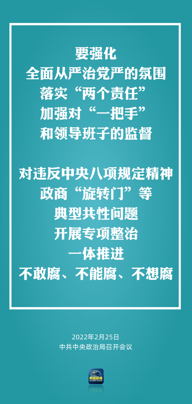 中共中央政治局2月25日召開會議,討論國務院擬提請第十三屆全國人民代表大會第五次會議審議的《政府工作報告》稿,審議《關于十九屆中央第八輪巡視情況的綜合報告》和《關于2021年中央巡視工作領導小組重點工作情況的報告》。中共中央總書記習近平主持會議。