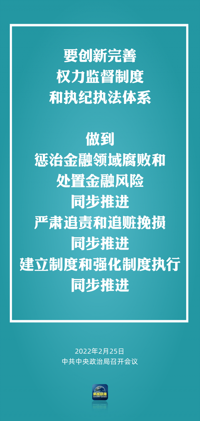 會議強調,要強化黨中央對金融工作的集中統(tǒng)一領導,堅定不移走好中國特色金融發(fā)展之路。要強化金融風險防控,堅決維護金融穩(wěn)定大局。要強化全面從嚴治黨嚴的氛圍,落實“兩個責任”,加強對“一把手”和領導班子的監(jiān)督,對違反中央八項規(guī)定精神、政商“旋轉門”等典型共性問題開展專項整治,一體推進不敢腐、不能腐、不想腐。要創(chuàng)新完善權力監(jiān)督制度和執(zhí)紀執(zhí)法體系,做到懲治金融領域腐敗和處置金融風險同步推進、嚴肅追責和追贓挽損同步推進、建立制度和強化制度執(zhí)行同步推進。要深入貫徹新時代黨的組織路線,強化領導班子隊伍建設。要深入推進金融領域改革,不斷提高金融治理體系和治理能力現(xiàn)代化水平。