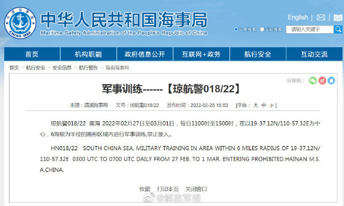 據(jù)中國(guó)海事局網(wǎng)站消息 清瀾海事局發(fā)布航行警告,2月27日至3月1日,每天11時(shí)至15時(shí),南海部分海域進(jìn)行軍事訓(xùn)練,禁止駛?cè)搿?/p>