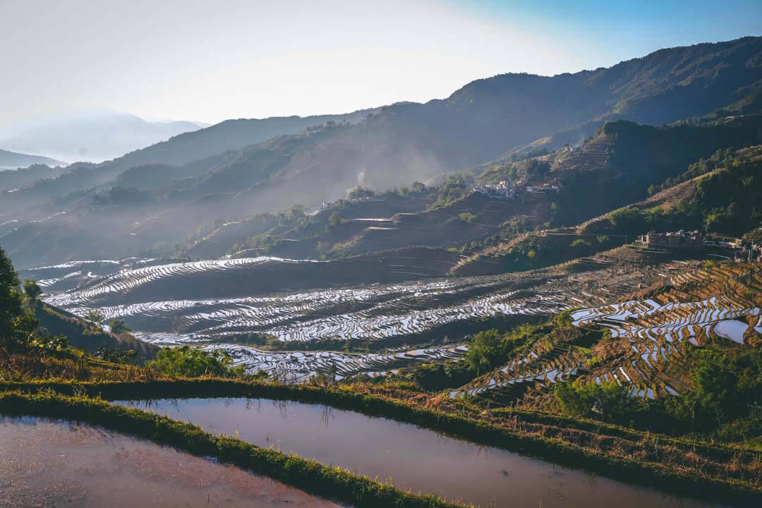 放眼望去,梯田順山而建,從山上看下去,一層層,一級級布滿了整個山谷。梯田里灌滿了水,陽光下,好似一面面鏡子錯落的擺放在山谷間,時時閃現(xiàn)出銀白色的光芒,如同一幅絕美的山水畫,畫在大山深處。