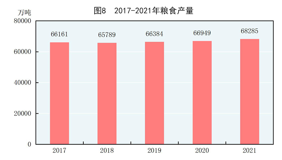 全年糧食產(chǎn)量68285萬噸,比上年增加1336萬噸,增產(chǎn)2.0%。其中,夏糧產(chǎn)量14596萬噸,增產(chǎn)2.2%;早稻產(chǎn)量2802萬噸,增產(chǎn)2.7%;秋糧產(chǎn)量50888萬噸,增產(chǎn)1.9%。全年谷物產(chǎn)量63276萬噸,比上年增產(chǎn)2.6%。其中,稻谷產(chǎn)量21284萬噸,增產(chǎn)0.5%;小麥產(chǎn)量13695萬噸,增產(chǎn)2.0%;玉米產(chǎn)量27255萬噸,增產(chǎn)4.6%。