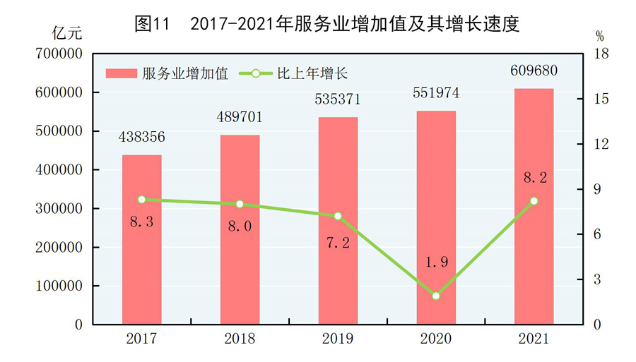 全年批發(fā)和零售業(yè)增加值110493億元,比上年增長11.3%;交通運輸、倉儲和郵政業(yè)增加值47061億元,增長12.1%;住宿和餐飲業(yè)增加值17853億元,增長14.5%;金融業(yè)增加值91206億元,增長4.8%;房地產(chǎn)業(yè)增加值77561億元,增長5.2%;信息傳輸、軟件和信息技術服務業(yè)增加值43956億元,增長17.2%;租賃和商務服務業(yè)增加值35350億元,增長6.2%。全年規(guī)模以上服務業(yè)企業(yè)營業(yè)收入比上年增長18.7%,利潤總額增長13.4%。