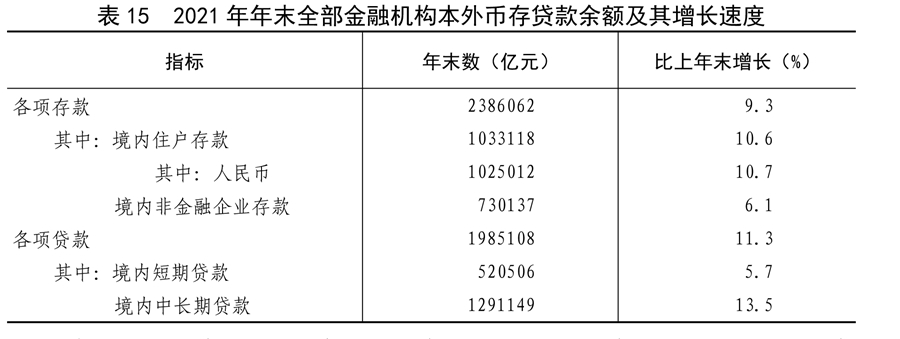 全年社會融資規(guī)模增量[45]31.4萬億元,按可比口徑計算,比上年少3.4萬億元。年末社會融資規(guī)模存量[46]314.1萬億元,按可比口徑計算,比上年末增長10.3%,其中對實體經(jīng)濟發(fā)放的人民幣貸款余額191.5萬億元,增長11.6%。年末全部金融機構本外幣各項存款余額238.6萬億元,比年初增加20.2萬億元,其中人民幣各項存款余額232.3萬億元,增加19.7萬億元。全部金融機構本外幣各項貸款余額198.5萬億元,增加20.1萬億元,其中人民幣各項貸款余額192.7萬億元,增加19.9萬億元。人民幣普惠金融貸款[47]余額26.5萬億元,增加5.0萬億元。
