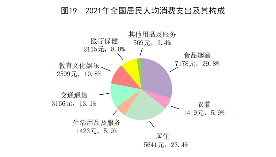 全年全國居民人均消費支出24100元,比上年增長13.6%,扣除價格因素,實際增長12.6%。其中,人均服務性消費支出[56]10645元,比上年增長17.8%,占居民人均消費支出的比重為44.2%。按常住地分,城鎮(zhèn)居民人均消費支出30307元,增長12.2%,扣除價格因素,實際增長11.1%;農(nóng)村居民人均消費支出15916元,增長16.1%,扣除價格因素,實際增長15.3%。全國居民恩格爾系數(shù)為29.8%,其中城鎮(zhèn)為28.6%,農(nóng)村為32.7%。