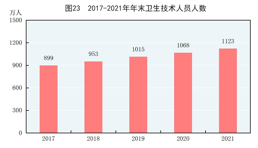 年末全國共有醫(yī)療衛(wèi)生機構103.1萬個,其中醫(yī)院3.7萬個,在醫(yī)院中有公立醫(yī)院1.2萬個,民營醫(yī)院2.5萬個;基層醫(yī)療衛(wèi)生機構97.7萬個,其中鄉(xiāng)鎮(zhèn)衛(wèi)生院3.5萬個,社區(qū)衛(wèi)生服務中心(站)3.6萬個,門診部(所)30.7萬個,村衛(wèi)生室59.9萬個;專業(yè)公共衛(wèi)生機構1.3萬個,其中疾病預防控制中心3380個,衛(wèi)生監(jiān)督所(中心)2790個。年末衛(wèi)生技術人員1123萬人,其中執(zhí)業(yè)醫(yī)師和執(zhí)業(yè)助理醫(yī)師427萬人,注冊護士502萬人。醫(yī)療衛(wèi)生機構床位957萬張,其中醫(yī)院748萬張,鄉(xiāng)鎮(zhèn)衛(wèi)生院144萬張。全年總診療人次[70]85.3億人次,出院人數(shù)[71]2.4億人。截至年末,全國累計報告新型冠狀病毒肺炎確診病例102314例,累計治愈出院病例94792例,累計死亡4636人。全國累計報告接種新型冠狀病毒疫苗283533萬劑次。全國共有11937家醫(yī)療衛(wèi)生機構提供新型冠狀病毒核酸檢測服務,總檢測能力達到4168萬份/天。