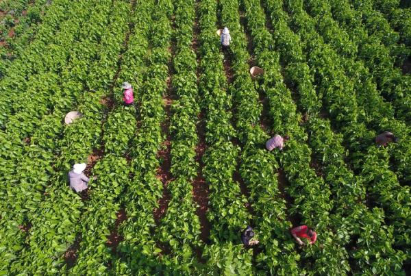 云南尋甸縣金所街道草海子村的農(nóng)婦在采摘蠶桑葉(2020年5月16日攝,無(wú)人機(jī)照片)。當(dāng)?shù)卮罅Πl(fā)展蠶桑等特色種養(yǎng)殖和加工產(chǎn)業(yè),帶動(dòng)農(nóng)民脫貧增收致富。新華社記者 楊宗友 攝