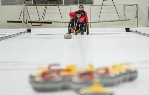 輪椅冰壺運動員王海濤(前)在國家殘疾人冰上運動比賽訓(xùn)練館投壺。新華社記者彭子洋攝。
