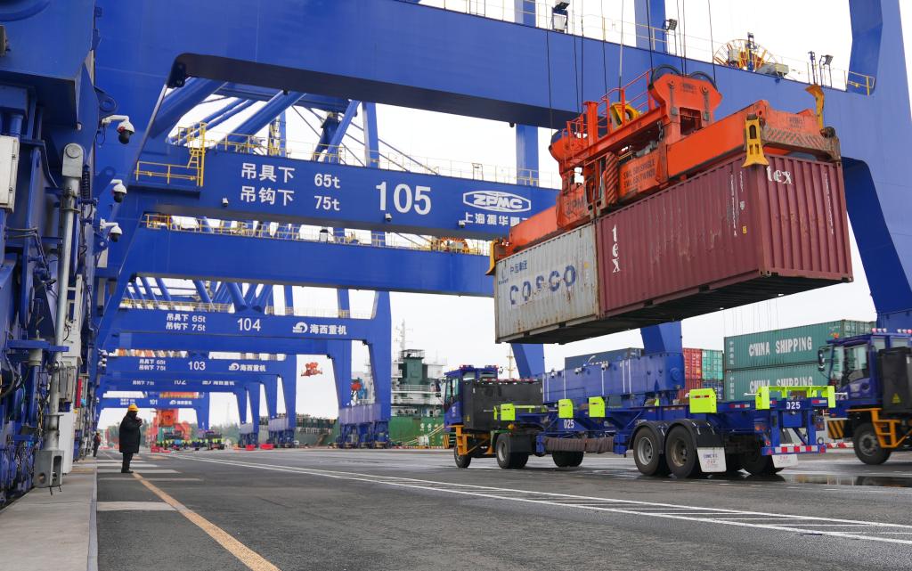 圖為2月21日下午,在洋浦國際集裝箱碼頭內(nèi),工作人員正引導(dǎo)貨車轉(zhuǎn)運(yùn)集裝箱。該碼頭是海南自貿(mào)港建設(shè)的重要集裝箱航運(yùn)樞紐。 新華社記者 王軍鋒 攝