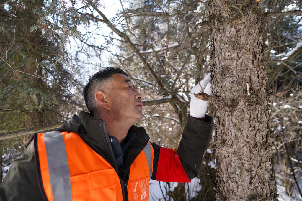 圖為2月20日,在青海省海東市的上北山林場,護(hù)林員趙以成正在觀察樹木長勢。 新華社記者 耿輝凰 攝