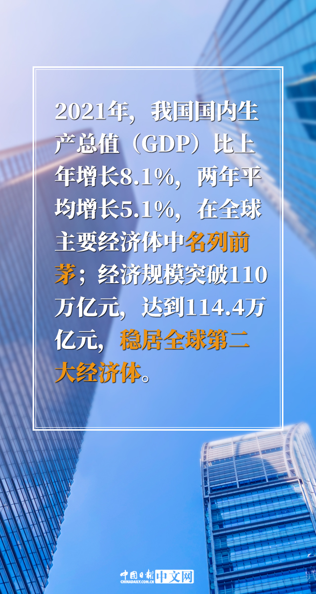 2021年,我國成功戰(zhàn)勝疫情等多重挑戰(zhàn),經(jīng)濟(jì)實力、社會生產(chǎn)力和綜合國力穩(wěn)步提高,改革開放創(chuàng)新深入推進(jìn),民生福祉持續(xù)提升,實現(xiàn)了“十四五”良好開局。最新發(fā)布的《2021年國民經(jīng)濟(jì)和社會發(fā)展統(tǒng)計公報》顯示,2021年,我國國內(nèi)生產(chǎn)總值(GDP)比上年增長8.1%,兩年平均增長5.1%,在全球主要經(jīng)濟(jì)體中名列前茅;連續(xù)5年蟬聯(lián)全球貨物貿(mào)易第一位;主要工業(yè)產(chǎn)品產(chǎn)量穩(wěn)居世界首位……我國遞出了一份亮眼的“成績單”。