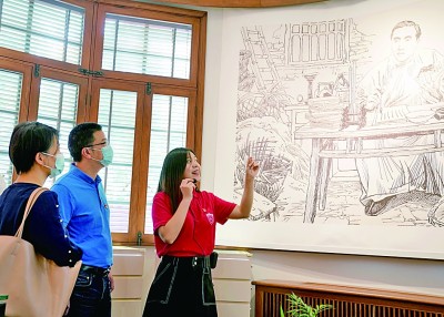 復(fù)旦大學(xué)《共產(chǎn)黨宣言》展示館里,黨員志愿者在為觀眾講解。新華社發(fā)
