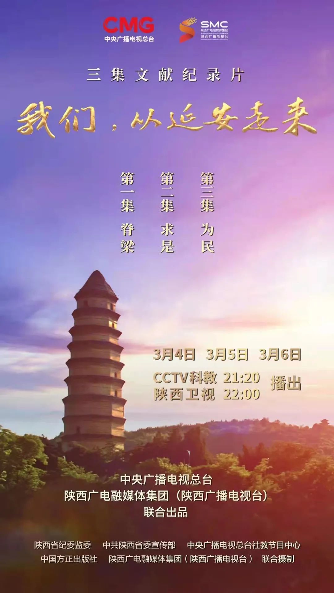 3月4日至3月6日每天21:20,由中央廣播電視總臺與陜西廣電融媒體集團(tuán)聯(lián)合出品的三集文獻(xiàn)紀(jì)錄片《我們,從延安走來》(每集45分鐘),將在中央廣播電視總臺央視科教頻道播出。本片深入貫徹黨的十九屆六中全會精神,以新時代的視角回顧中國共產(chǎn)黨在延安的革命歷史,講述新中國從延安走來的故事,闡釋延安精神,是迎接黨的二十大,解讀中國共產(chǎn)黨人精神譜系的重要影視作品。