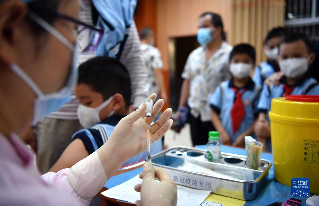 醫(yī)護人員在?谑协偵降谌W(xué)為學(xué)生接種疫苗(2021年10月28日攝)。新華社記者 郭程 攝