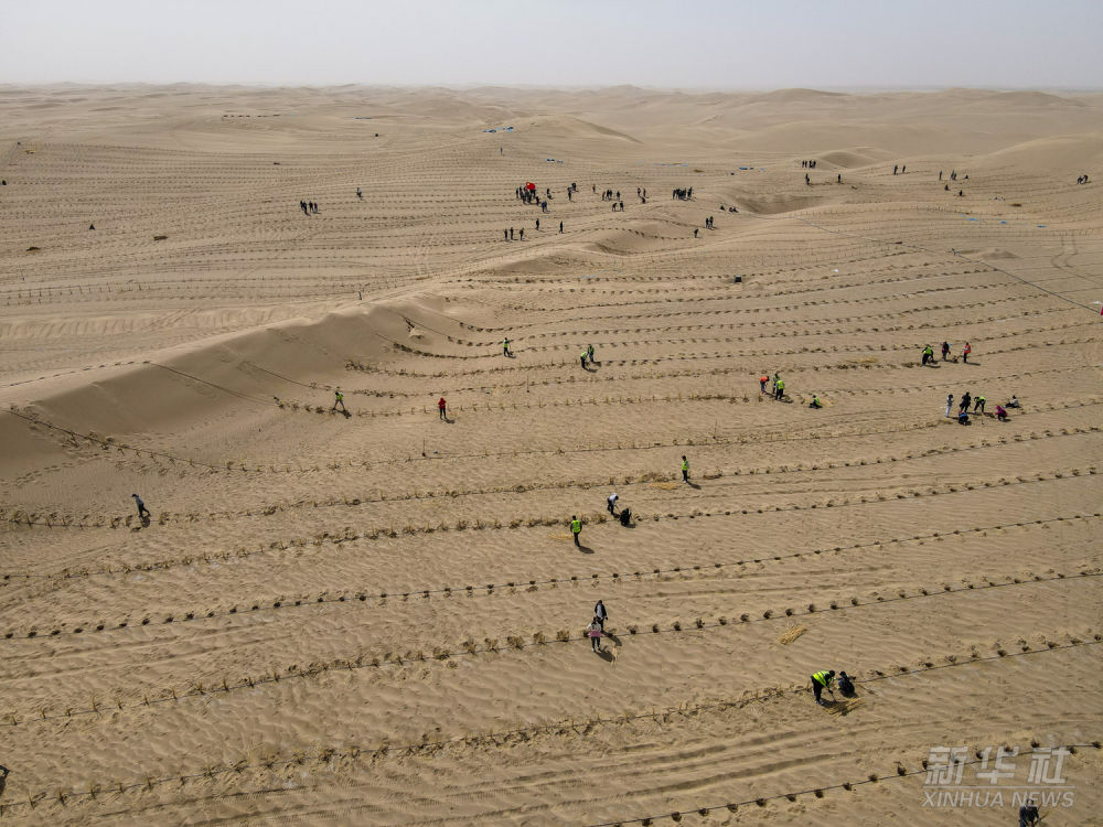 人們在距離新疆且末縣城不遠(yuǎn)處的塔克拉瑪干沙漠內(nèi)植樹(無人機(jī)照片,2021年3月28日攝)。