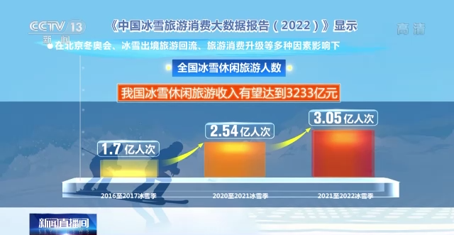 中國(guó)旅游研究院今年初發(fā)布的《中國(guó)冰雪旅游消費(fèi)大數(shù)據(jù)報(bào)告(2022)》顯示,在北京冬奧會(huì)、冰雪出境旅游回流、旅游消費(fèi)升級(jí)等多種因素影響下,全國(guó)冰雪休閑旅游人數(shù)從2016至2017冰雪季的1.7億人次增加至2020至2021冰雪季的2.54億人次,預(yù)計(jì)2021至2022冰雪季將達(dá)到3.05億人次,我國(guó)冰雪休閑旅游收入有望達(dá)到3233億元。