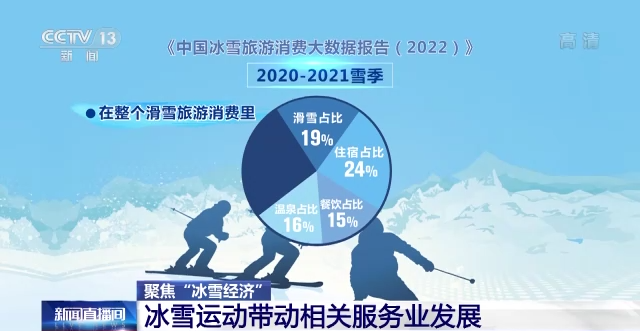 場(chǎng)館數(shù)量的增加,直接帶動(dòng)場(chǎng)地維護(hù)、餐飲住宿等服務(wù)業(yè)的發(fā)展!吨袊(guó)冰雪旅游消費(fèi)大數(shù)據(jù)報(bào)告(2022)》顯示,在整個(gè)滑雪旅游消費(fèi)里,滑雪占比為19%,住宿占比24%,餐飲占比15%,溫泉占比16%。