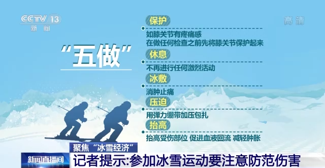 專家提醒,參加冰雪運(yùn)動(dòng)之前,最好能加強(qiáng)自身平衡性、協(xié)調(diào)性、力量等方面的鍛煉,運(yùn)動(dòng)前最好是熱身10-15分鐘;其次,運(yùn)動(dòng)時(shí)最好能戴上頭盔、護(hù)目鏡、護(hù)膝、護(hù)肘、手套等必要的防護(hù)裝備。如果在冰雪運(yùn)動(dòng)中發(fā)生了運(yùn)動(dòng)損傷,要牢記“五做四不做”: