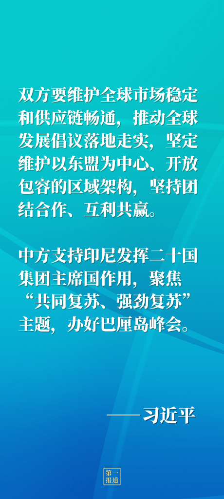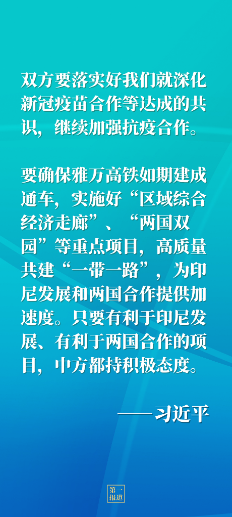 習(xí)近平強(qiáng)調(diào),雙方要落實(shí)好我們就深化新冠疫苗合作等達(dá)成的共識(shí),繼續(xù)加強(qiáng)抗疫合作。要確保雅萬高鐵如期建成通車,實(shí)施好“區(qū)域綜合經(jīng)濟(jì)走廊”、“兩國雙園”等重點(diǎn)項(xiàng)目,高質(zhì)量共建“一帶一路”,為印尼發(fā)展和兩國合作提供加速度。只要有利于印尼發(fā)展、有利于兩國合作的項(xiàng)目,中方都持積極態(tài)度。雙方要維護(hù)全球市場穩(wěn)定和供應(yīng)鏈暢通,推動(dòng)全球發(fā)展倡議落地走實(shí),堅(jiān)定維護(hù)以東盟為中心、開放包容的區(qū)域架構(gòu),堅(jiān)持團(tuán)結(jié)合作、互利共贏。中方支持印尼發(fā)揮二十國集團(tuán)主席國作用,聚焦“共同復(fù)蘇、強(qiáng)勁復(fù)蘇”主題,辦好巴厘島峰會(huì)。