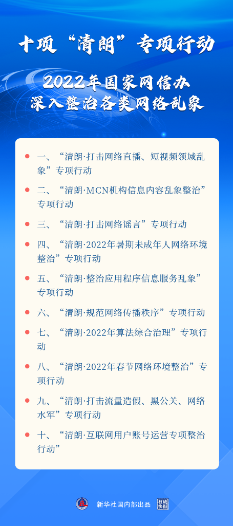 國(guó)家網(wǎng)信辦部署開(kāi)展2022年“清朗”系列專項(xiàng)行動(dòng),聚焦影響面廣、危害性大的問(wèn)題開(kāi)展整治,具體包括10個(gè)方面重點(diǎn)任務(wù)
