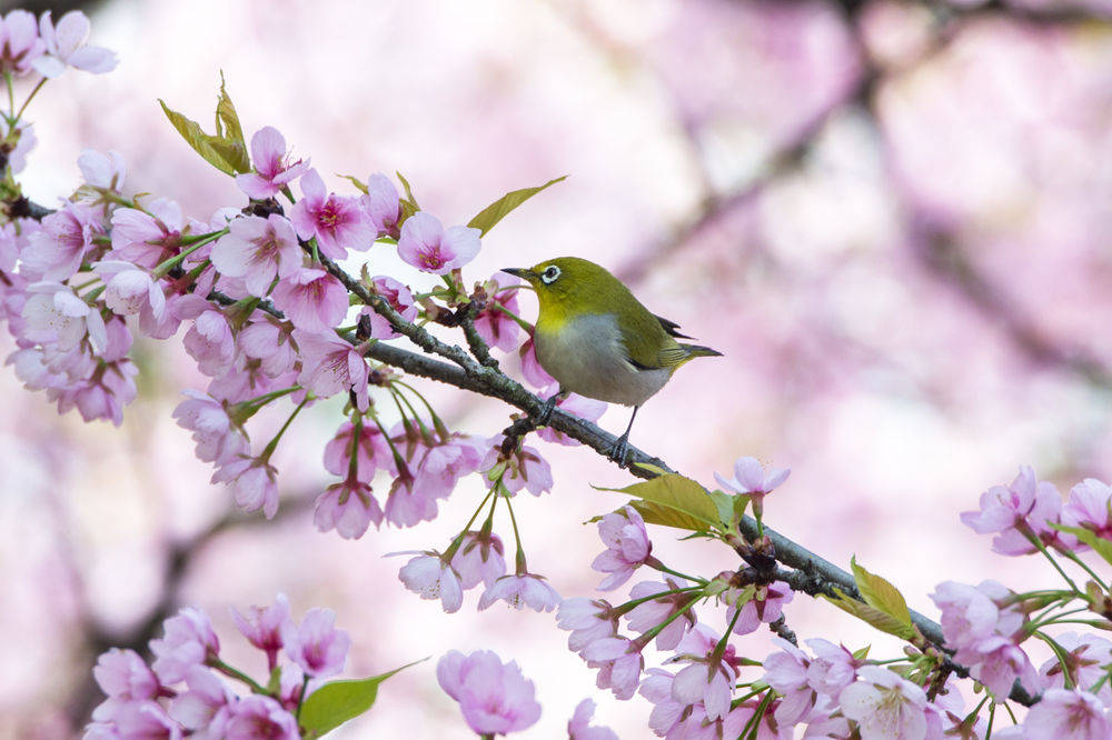 ↑ 一只繡眼鳥在江蘇無錫太湖黿頭渚景區(qū)的櫻花枝頭上小憩。