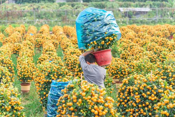 △2022年1月21日,廣州南沙區(qū)魚窩頭細(xì)瀝村的農(nóng)田上種植了大量年橘盆栽,枝頭上掛滿了果實(shí),正在現(xiàn)場(chǎng)出售中。