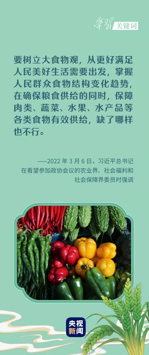 3月6日,習(xí)近平總書記在看望參加全國(guó)政協(xié)十三屆五次會(huì)議的農(nóng)業(yè)界、社會(huì)福利和社會(huì)保障界委員時(shí),強(qiáng)調(diào)要樹立大食物觀,從更好滿足人民美好生活需要出發(fā),掌握人民群眾食物結(jié)構(gòu)變化趨勢(shì),在確保糧食供給的同時(shí),保障肉類、蔬菜、水果、水產(chǎn)品等各類食物有效供給,缺了哪樣也不行。