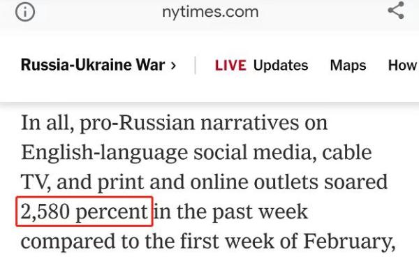 △《紐約時(shí)報(bào)》文章說(shuō),2月末,英文社交媒體上,挺俄言論相比2月初漲了25.8倍。