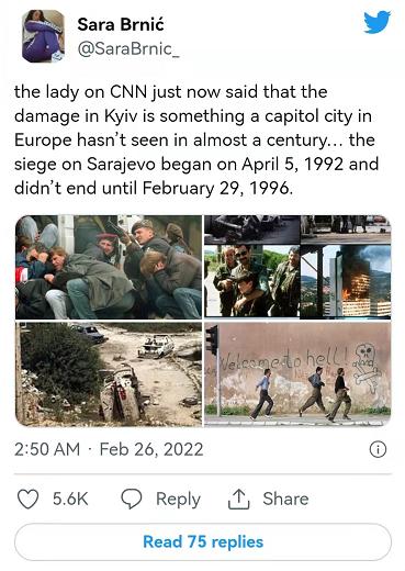 △塞爾維亞網(wǎng)友痛斥美媒無(wú)知:美國(guó)有線電視新聞網(wǎng)(cnn)說(shuō)基輔受到的破壞是歐洲首都城市近百年所未見(jiàn),但薩拉熱窩在90年代可是被圍困了四年之久。