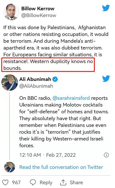 一位記者指出,英國(guó)廣播公司(bbc)對(duì)烏克蘭人制作燃燒瓶對(duì)付俄羅斯軍人的行為大加贊揚(yáng),但當(dāng)巴勒斯坦人因?yàn)橄蜓b備全副西式武裝的士兵扔石子被殺時(shí),西方卻稱巴勒斯坦人為“恐怖分子”。一位肯尼亞政治家說(shuō)得更直接:“西方雙標(biāo)起來(lái)沒(méi)有底線!