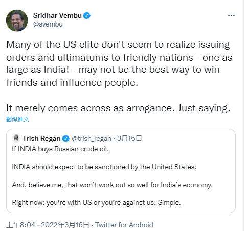 美國(guó)?怂股虡I(yè)頻道女主播翠西·里根15日也在社交媒體上發(fā)文稱,“如果印度購(gòu)買俄羅斯原油,應(yīng)該受到美國(guó)制裁。這對(duì)印度經(jīng)濟(jì)來(lái)說(shuō)不是好事。現(xiàn)在(印度面臨的選擇)是支持美國(guó)還是反對(duì)美國(guó),這很簡(jiǎn)單!庇《雀簧、軟件公司zoho創(chuàng)始人斯里達(dá)爾·芬布隨后轉(zhuǎn)發(fā)該帖文寫道,“許多美國(guó)精英似乎沒(méi)有意識(shí)到,對(duì)一個(gè)像印度這樣大的友好國(guó)家發(fā)號(hào)施令和下達(dá)最后通牒,可能不是贏得朋友和影響他人的最佳方式。只能給人傲慢的印象。”