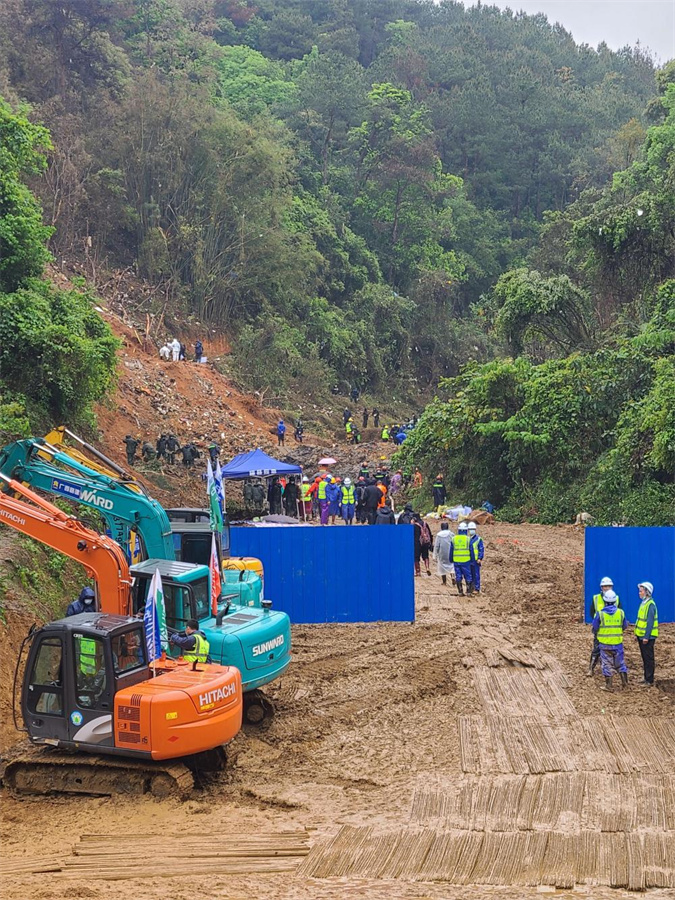 23日上午,受連續(xù)降溫降雨天氣影響,事故現(xiàn)場濕滑泥濘,對搜尋工作造成一定影響。22日緊急開辟的一條通往事故核心現(xiàn)場的道路已經(jīng)修通。為方便雨天行走,工作人員在路上鋪設(shè)了一條竹編小道。記者現(xiàn)場了解到,工作人員計劃采取更多措施,以減輕降雨的影響。