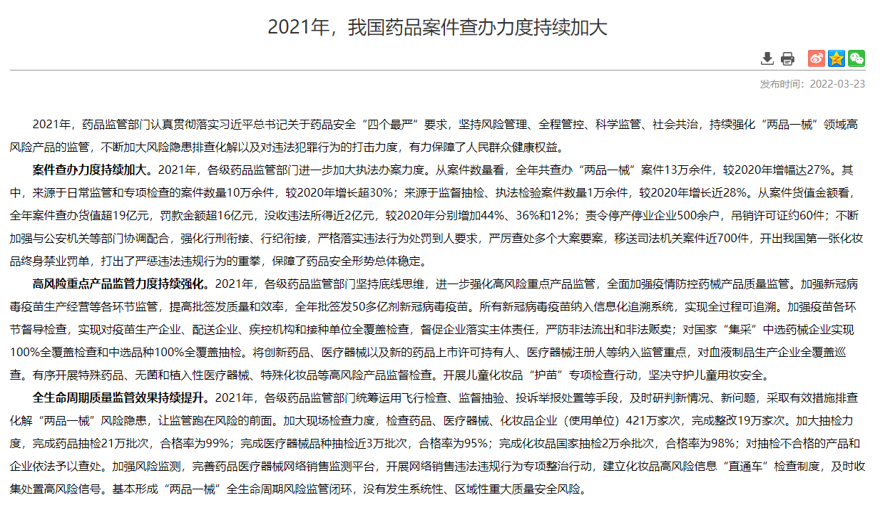 2021年,我國(guó)藥品案件查辦力度持續(xù)加大,各級(jí)藥品監(jiān)管部門完成藥品抽檢21萬(wàn)批次,合格率為99%;完成醫(yī)療器械品種抽檢近3萬(wàn)批次,合格率為95%;完成化妝品國(guó)家抽檢2萬(wàn)余批次,合格率為98%;對(duì)抽檢不合格的產(chǎn)品和企業(yè)依法予以查處。