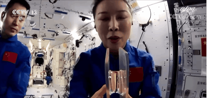 航天員 王亞平:同學(xué)們好,我是太空教師王亞平。今天,我想給大家展示另外一個(gè)有趣的現(xiàn)象,這個(gè)現(xiàn)象還和我們國家的一項(xiàng)非物質(zhì)文化遺產(chǎn)有關(guān),請(qǐng)大家仔細(xì)觀察。