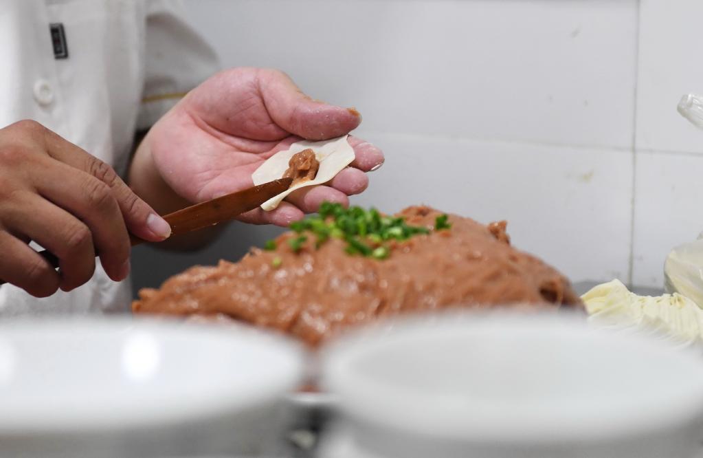 2021年6月11日,在三明市沙縣區(qū),沙縣廟門扁肉傳承人王盛濱在包制沙縣扁肉。新華社記者林善傳攝