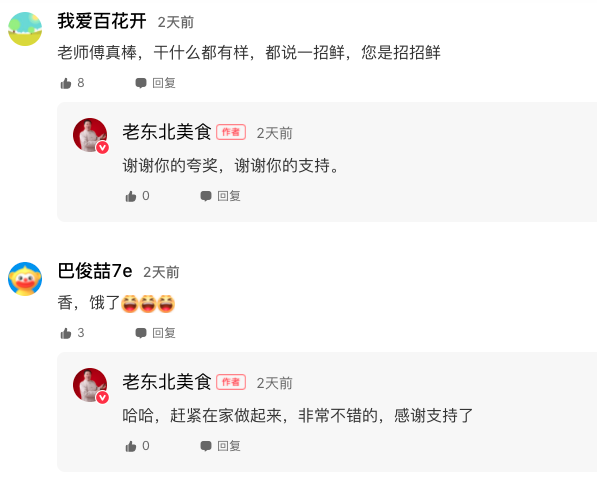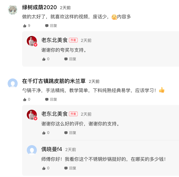 說到做短視頻以來最大的收獲,老東北感嘆道:“由于原來教學(xué)方式枯燥很難理解,一些比較老的菜品和烹飪方法,幾乎很難被大家熟知,面臨失傳,通過短視頻的方式可以很好的保留和宣傳,每天在好看視頻上瀏覽粉絲們的留言,回復(fù)大家的問題,感覺特有成就感!”