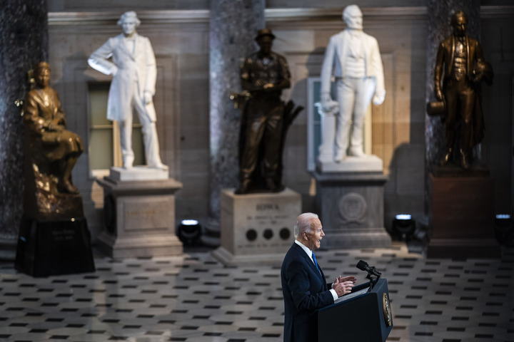 1月6日,美國(guó)總統(tǒng)拜登在華盛頓國(guó)會(huì)大廈發(fā)表講話,紀(jì)念國(guó)會(huì)山騷亂事件一周年。新華社發(fā)