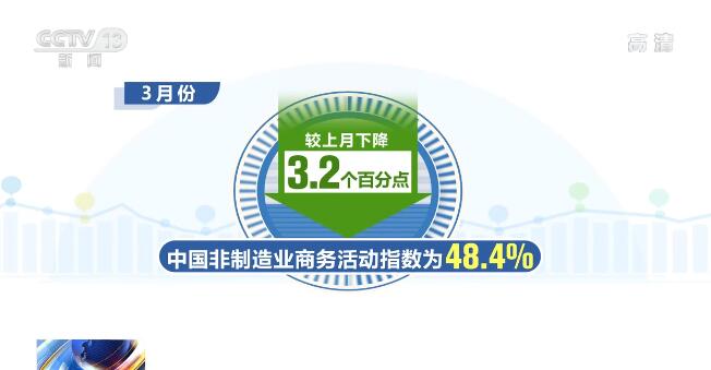 3月份,中國(guó)非制造業(yè)商務(wù)活動(dòng)指數(shù)為48.4%,較上月下降3.2個(gè)百分點(diǎn);新訂單指數(shù)為45.7%,較上月下降1.9個(gè)百分點(diǎn),顯示非制造業(yè)供需增速較上月均明顯放緩。