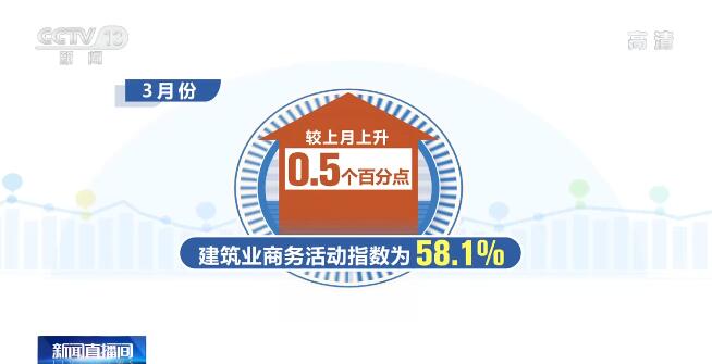 另外,受疫情影響相對(duì)較小的行業(yè)活動(dòng)表現(xiàn)良好,較好發(fā)揮了托底非制造業(yè)增長(zhǎng)的作用。其中,3月份,建筑業(yè)商務(wù)活動(dòng)指數(shù)為58.1%,較上月上升0.5個(gè)百分點(diǎn),連續(xù)2個(gè)月環(huán)比上升。