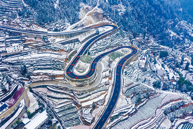 湖北省宜昌市秭歸縣把“四好農(nóng)村路”建設(shè)與“美麗鄉(xiāng)村”、“全域旅游”建設(shè)深度融合,助力鄉(xiāng)村振興。圖為芝茅路(芝蘭—茅坪)在雪中蜿蜒(2022年1月29日攝)。 求是圖片 鄭坤/攝