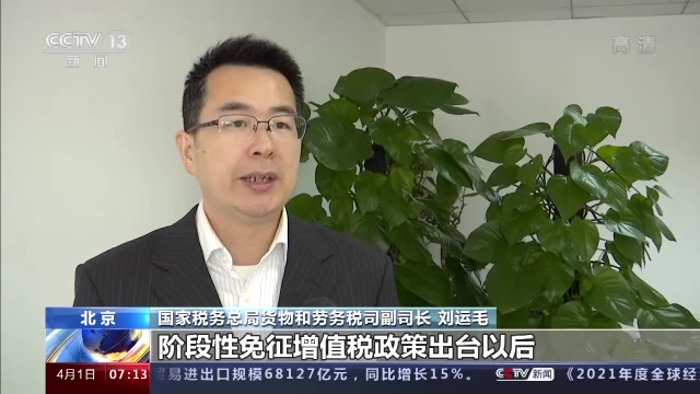 國(guó)家稅務(wù)總局貨物和勞務(wù)稅司副司長(zhǎng)劉運(yùn)毛:對(duì)于此前月銷售額在15萬元以上,超過起征點(diǎn)不能享受免稅政策的小規(guī)模納稅人,今年也可以享受免稅,稅負(fù)降到零。