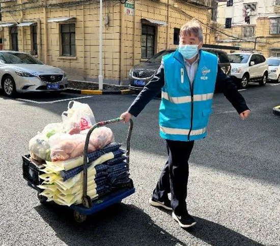 長(zhǎng)寧區(qū)仙霞新村街道,仙霞物業(yè)公司負(fù)責(zé)管理的一封控小區(qū),老年人比較多,被封控之后,他們不會(huì)使用智能手機(jī)上網(wǎng)購(gòu)買生活物資。因此,物業(yè)工作人員便成了小區(qū)的“閃送員”,主動(dòng)承擔(dān)起為小區(qū)獨(dú)居老人、高齡老人和行動(dòng)不便老人采購(gòu)生活物資的工作。長(zhǎng)寧融媒體中心供圖